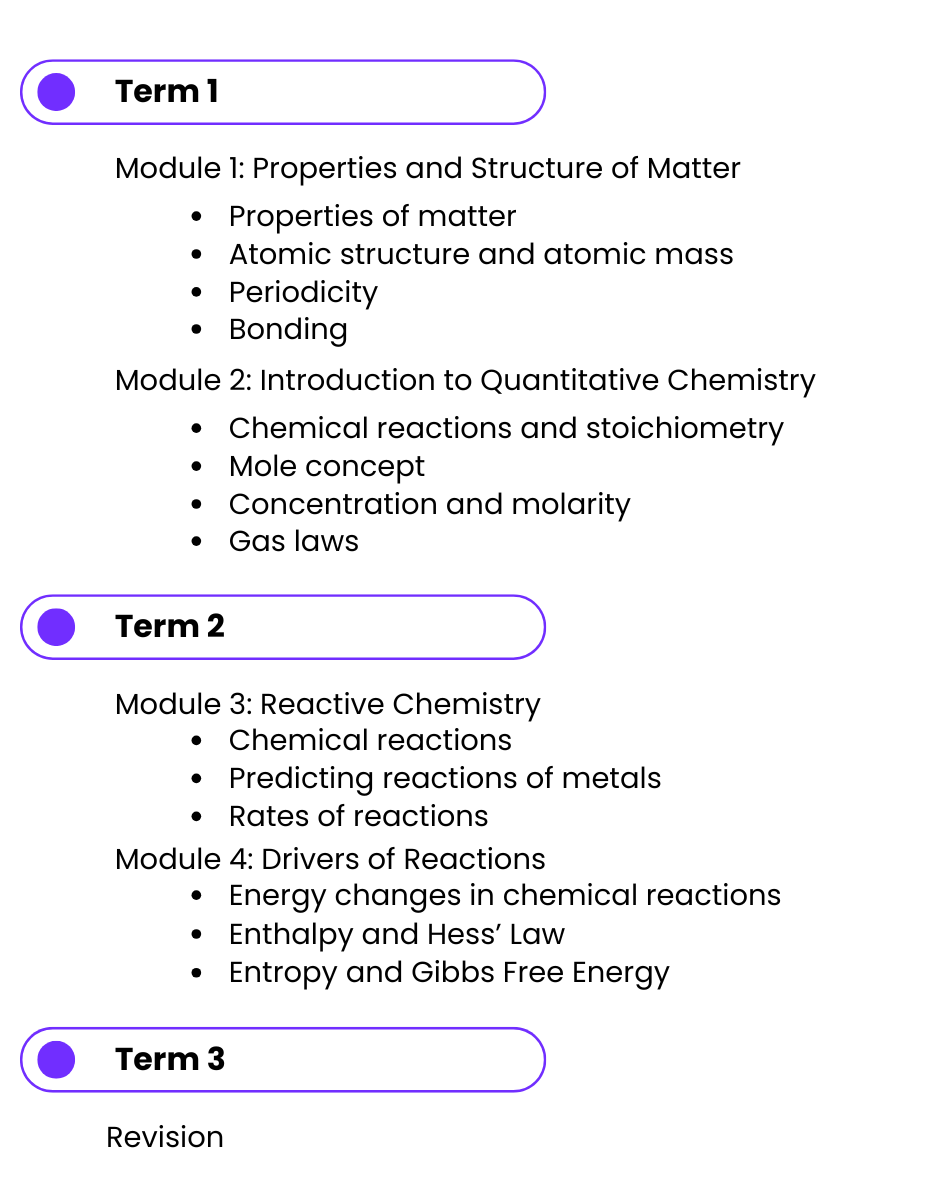 Year 11 Chemistry Course Overview This topic order can be flexibly rearranged to align with your current learning needs and school sequence. Request Your Free Trial Lesson